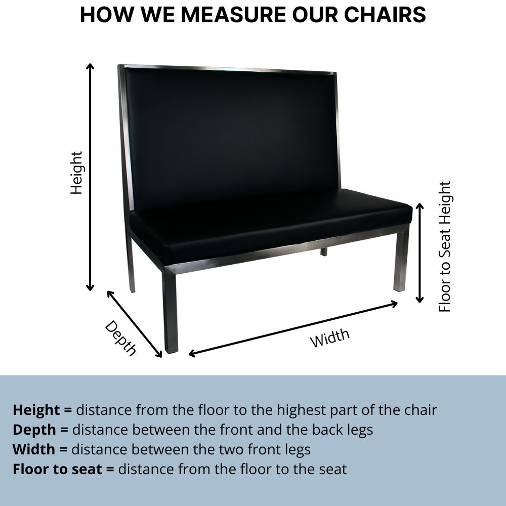 Features Material Black vinyl upholstered seat and back Stainless steel frame Finish n/a Indoor/Outdoor Indoor use only Needs Assembly No Dimensions D 640mm x W 1200mm x H 1080mm Floor to seat 430mm Stackable No Quality Commercial grade Warranty 12 month Other Features Matches perfectly with our 800x1200mm tables Please be aware that while utmost…
