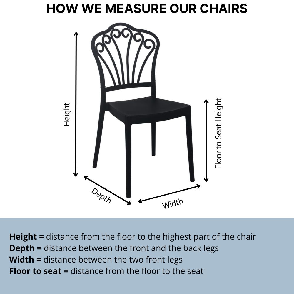 Features Material Polypropylene single mould injection reinforced with Fibre Glass Finish n/a Indoor/Outdoor Indoor and Outdoor use Needs Assembly No assembly required Dimensions D 450mm x W 500mm x H 890mm Floor to seat: 450mm Weight: 3.7kg Stackable Yes Quality Commercial grade Warranty 1 year warranty against faults arising from defective workmanship Other Features Static…