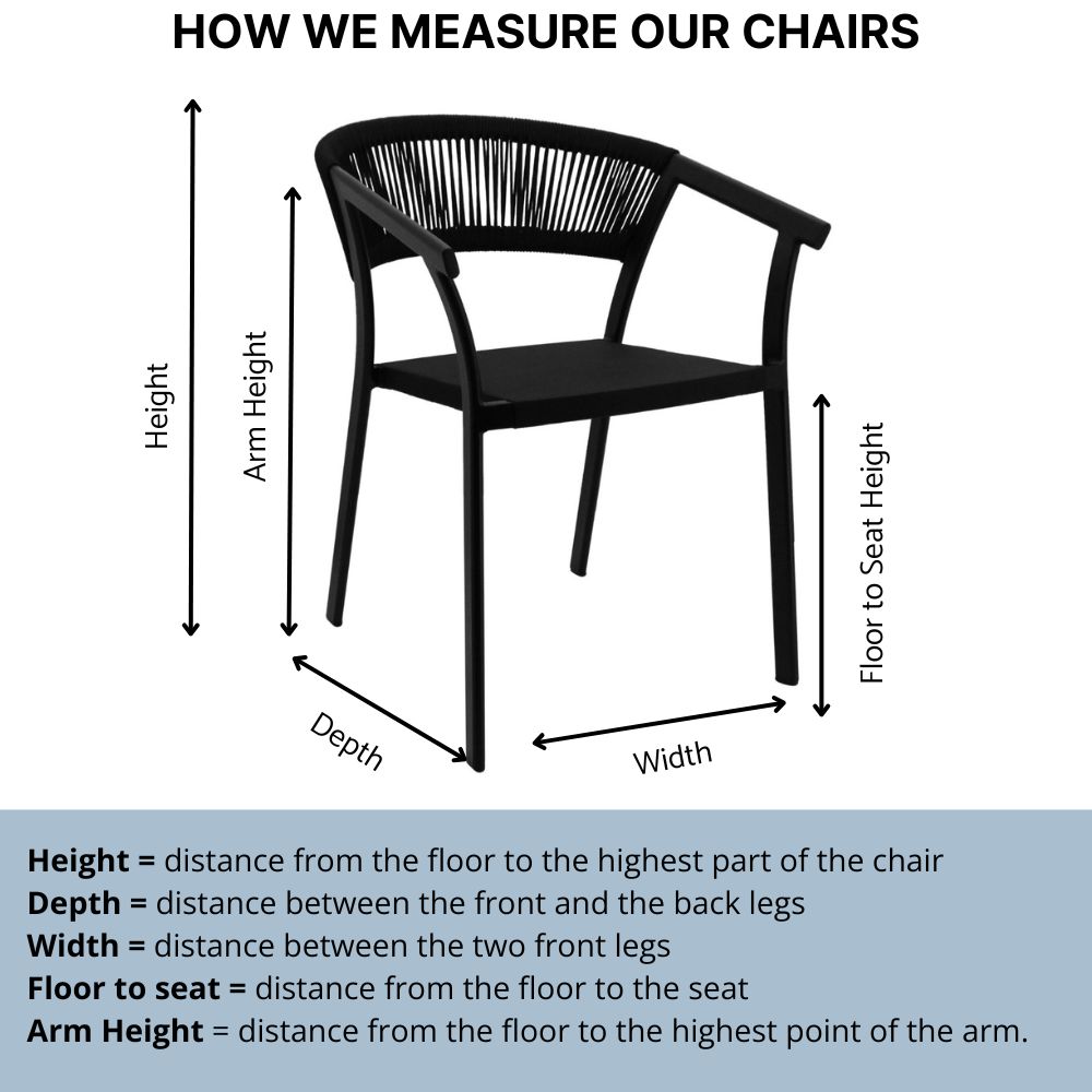 Features Material Aluminium and rope Finish N/A Indoor/Outdoor Indoor and Outdoor use Needs Assembly No Dimensions D 580mm x W 510mm x H 780mm Floor to seat: 460mm Arm height: 720mm Weight: 3kg Stackable Yes Quality Commercial grade Warranty 12 Months Other Features Extra support under seat Static Seat Load tested to 250kg Please…