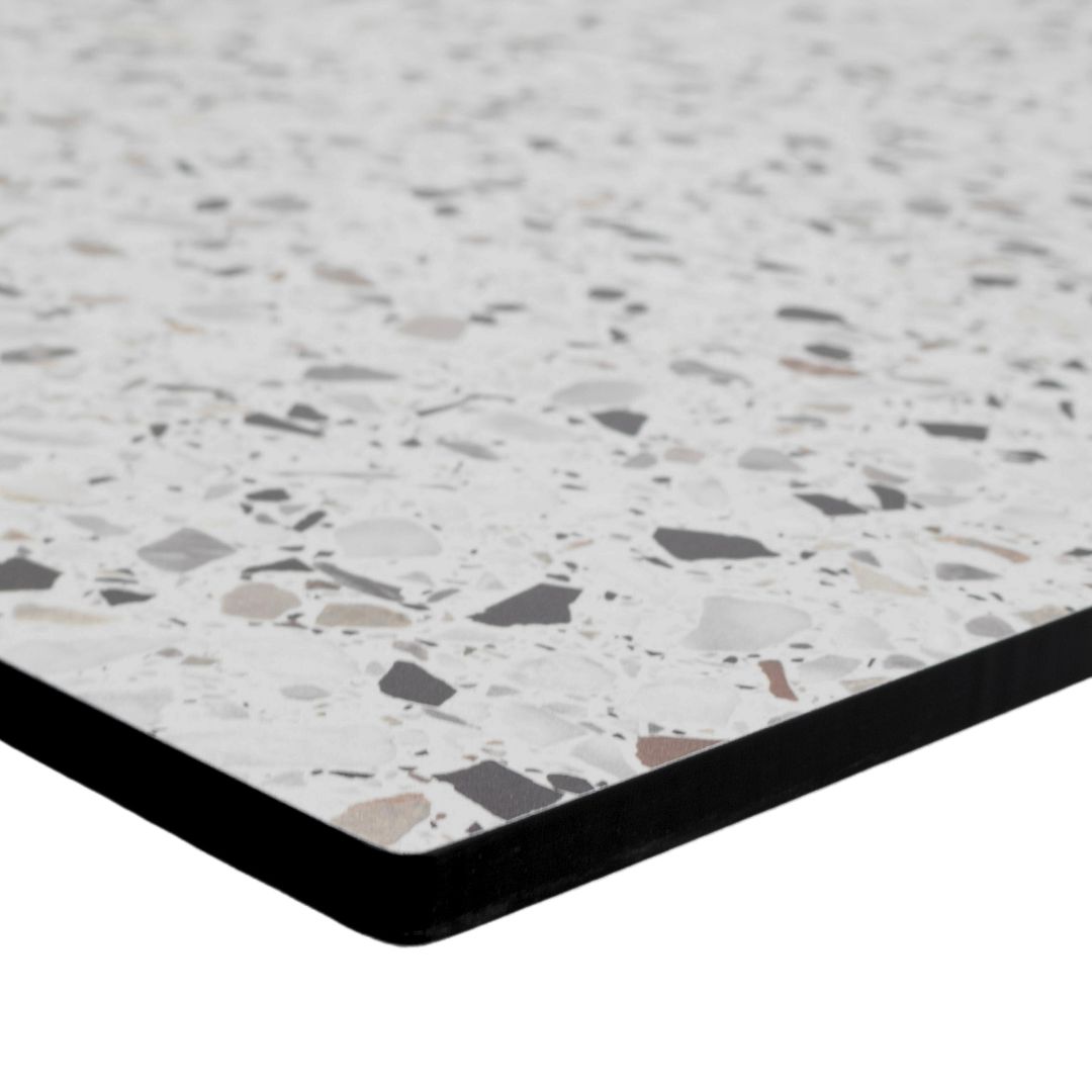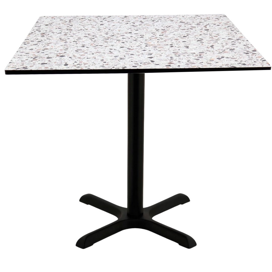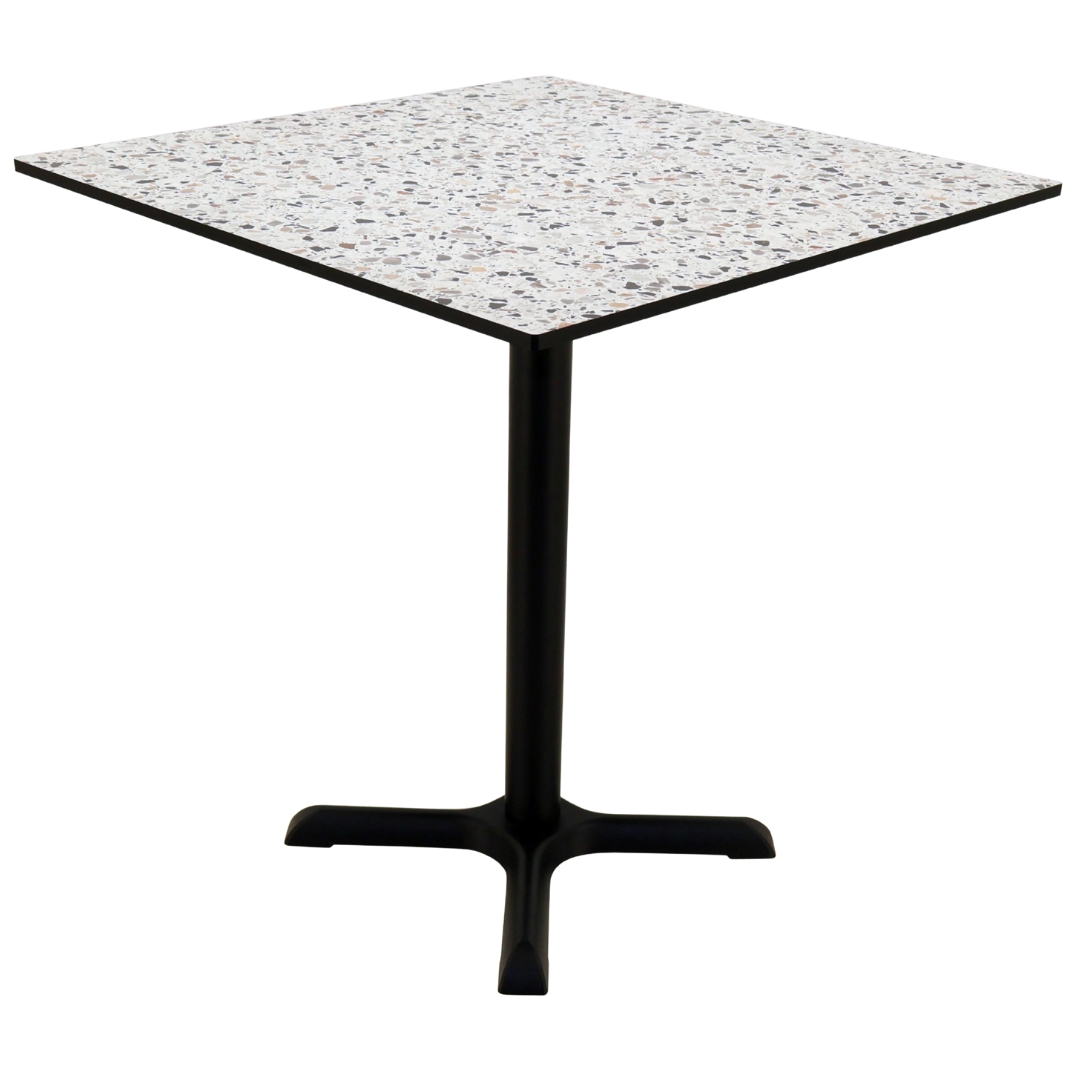 Table Top: Matte Terrazzo Compact Laminate with Flat Black Edge Base: Matte Black Powdercoat |