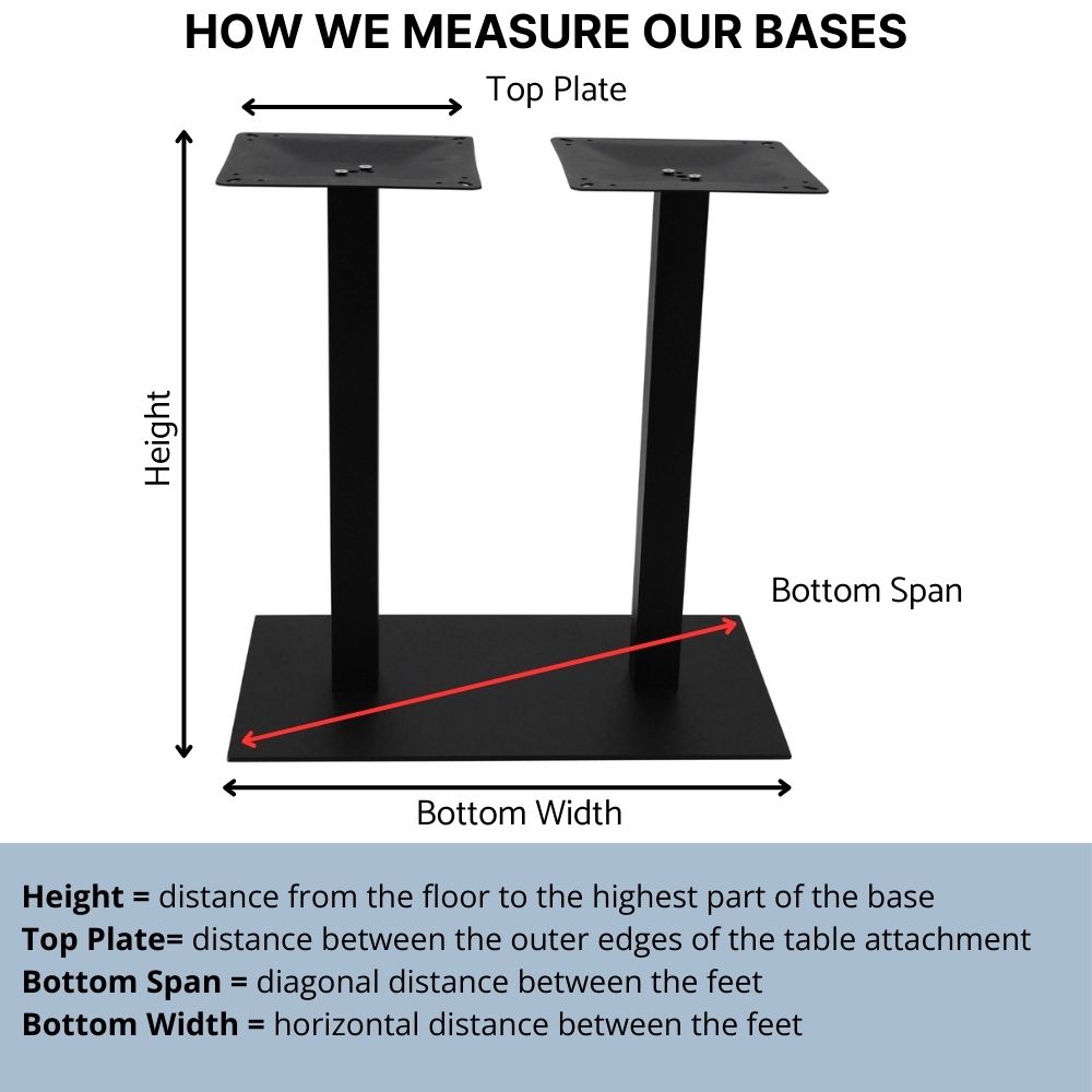 FEATURES Material Steel Finish Matte Black Powdercoat Indoor/Outdoor Indoor and Outdoor Use Needs Assembly Yes. Easy to assemble Screws included Yes Dimensions Height: 1050mm Top span: 500mm Bottom Span: 800mm Bottom Length: 700mm Bottom Width: 400mm Quality Commercial grade Warranty 12 months Max top size 800 x 1200 Please note that this base does not come…