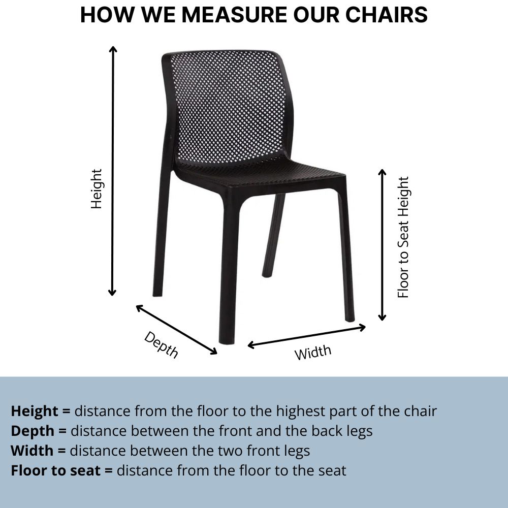 Features Material Polypropylene single mould injection Finish N/A Indoor/Outdoor Indoor and Outdoor use Needs Assembly No Dimensions D 570mm x W 460mm x H 830mm Floor to seat: 460mm Weight: 3.2kg Stackable Yes Quality Commercial grade Warranty 1 year warranty against faults arising from defective workmanship Other Features Static Seat Load Tested to 120kg…