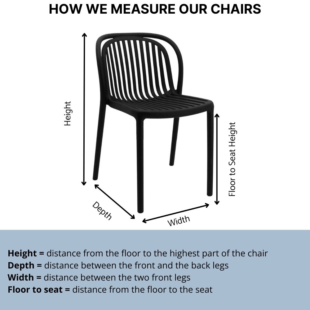 Features Material Polypropylene single mould injection reinforced with Fibre Glass Finish n/a Indoor/Outdoor Indoor and Outdoor use Needs Assembly No assembly required Dimensions D 490mm x W 400mm x H 770mm Weight: 4.2kg Floor to seat: 460mm Stackable Yes Quality Commercial grade Warranty 3 year warranty against faults arising from defective workmanship Other Features 250kg…