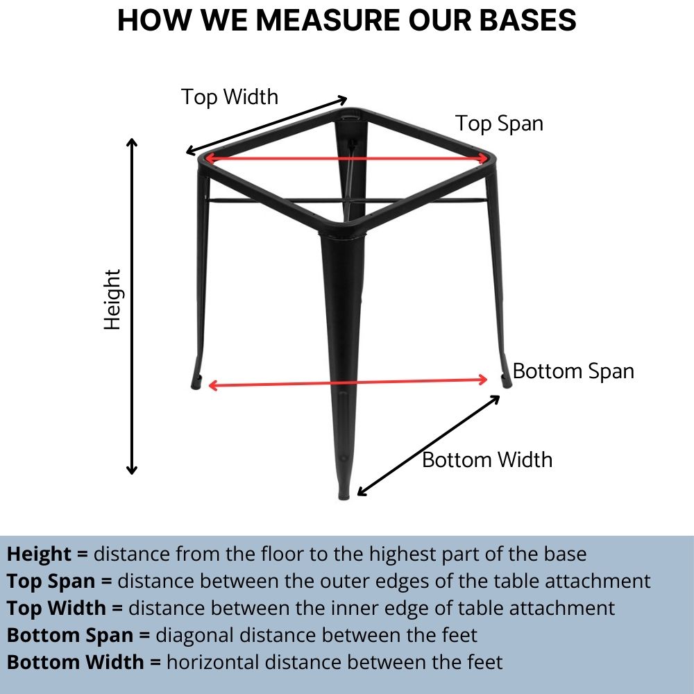 Features Material Steel Finish Matte black Powdercoat Indoor/Outdoor Indoor Use Only Needs Assembly Yes Screws included Yes Dimensions Height: 740mm Bottom span: 670mm Top span: 570mm Quality Commercial grade Warranty 12 month Table Top size required 800mm x 800mm CUSTOMERS PLEASE NOTE: The screws are universal and the thickness of the tables vary. If the…